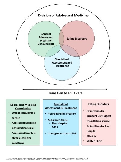 The Division of Adolescent Medicine is committed to providing high quality, developmentally-appropriate clinical care to youth and their families through our specialty clinical programs. See our model of care at a glance (pdf) and information on our general consultation services, specialized assessment and treatment programs, and eating disorder units.