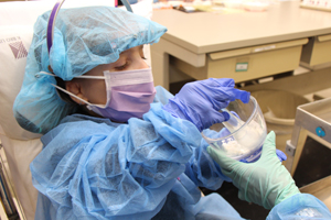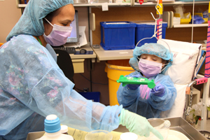 With the help of Pacita Sales, Senior Pharmacy Technician, Isabella threw on a gown and a pair of gloves and prepared a special chocolate-flavoured compound.