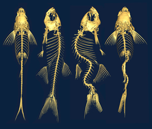 Three-dimensional micro-computed tomography reconstructions showing the skeleton of (two left fish) a normal adult zebrafish and (two right fish) a zebrafish model of adolescent idiopathic scoliosis. The zebrafish develop a normal spine when the Ptk7 gene is functioning normally but a curved spine when the gene is mutated.
