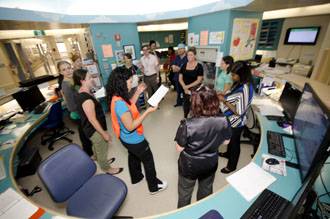 Downstairs at the Operating Room desk, staff members waited for additional instructions or announcements. When a Code Green is called, both clinical and non-clinical staff from any area of the hospital – as well as staff in other SickKids buildings – may be redeployed to help with the evacuation of patient care areas.