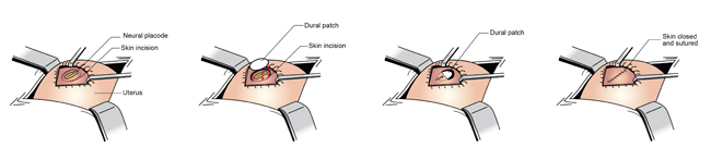 - Drs. Drake and Abhaya Kulkarni from SickKids began the neurosurgical component of the procedure by dissecting out the neural placode from the surrounding tissue. An artificial dural patch was then placed over the exposed neural tissue. The surrounding skin was freed up, allowing it to be closed over the spinal defect. The neurosurgical portion took 25 minutes.