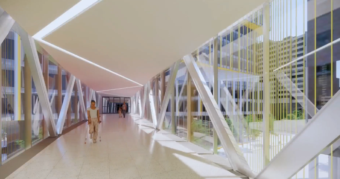 A view of the interior of the bridge frame, looking towards the hospital Atrium.