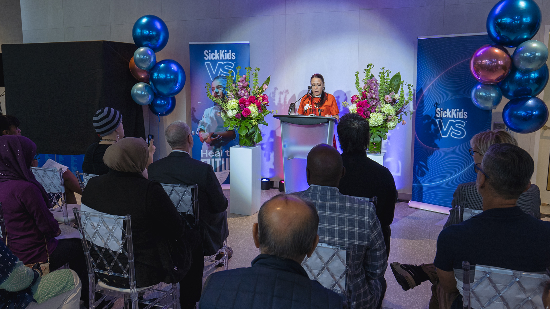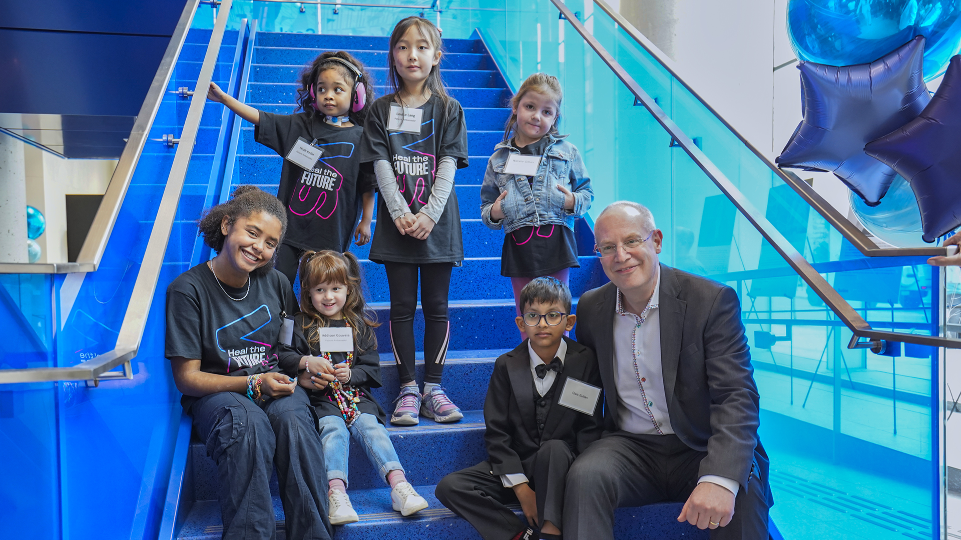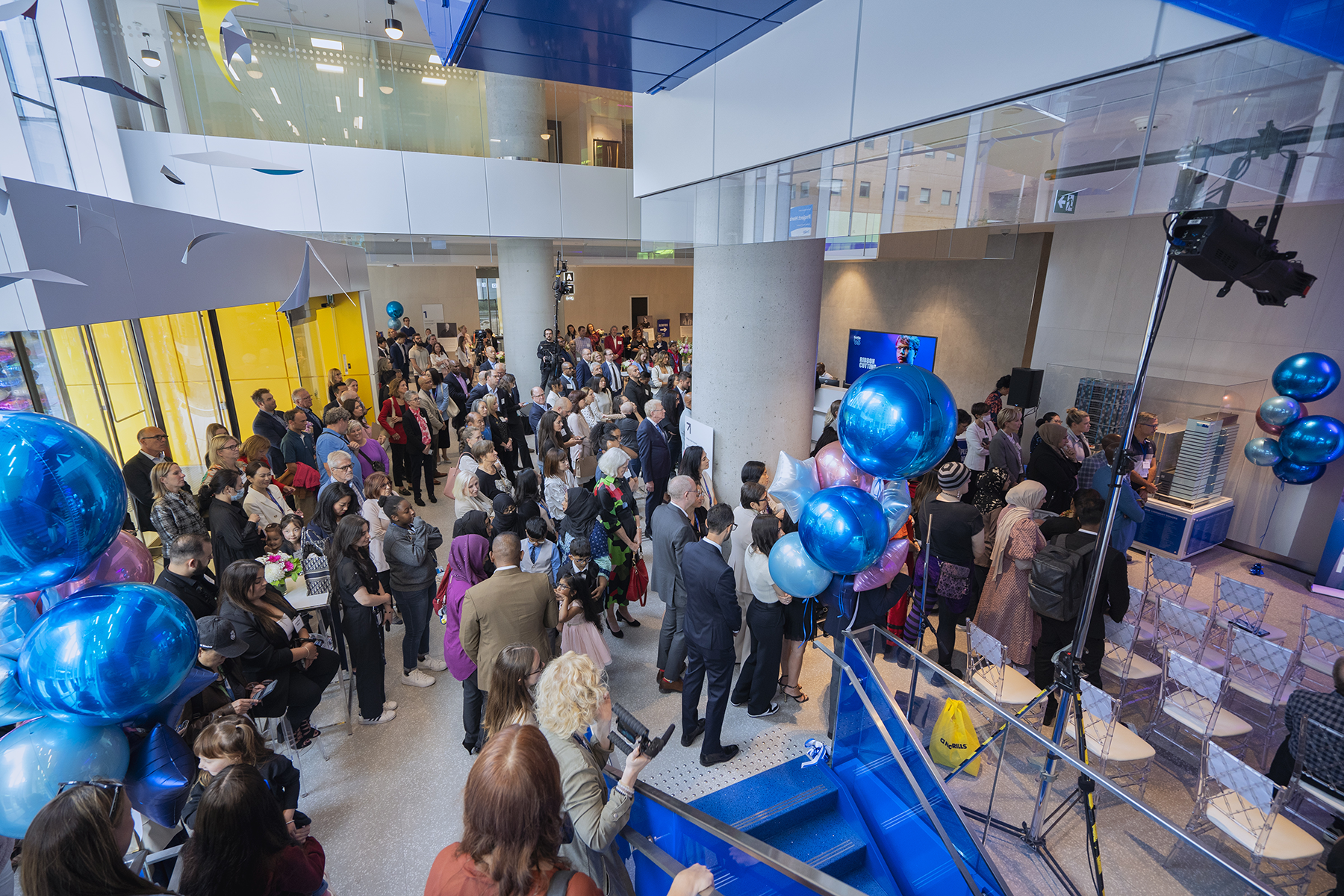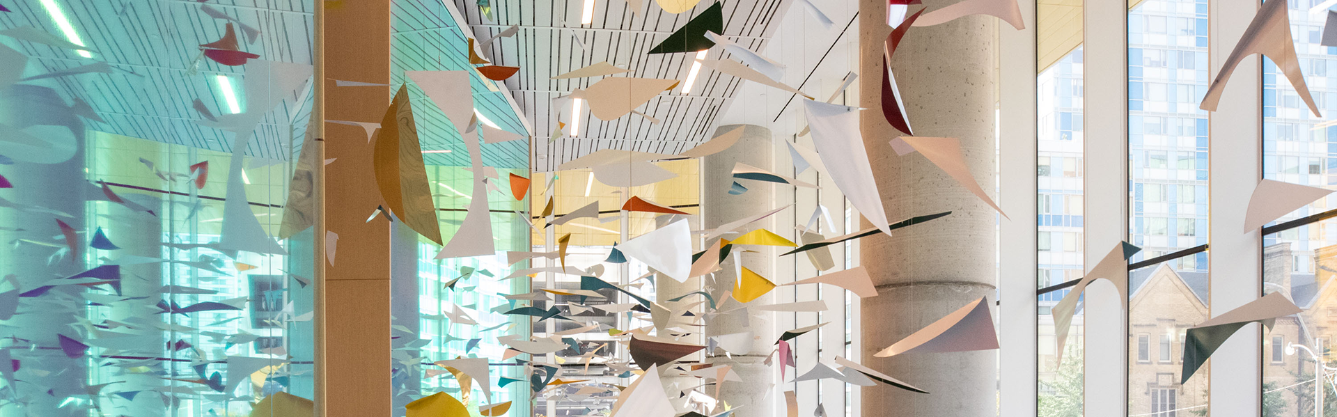 Attendees gathered in the building’s light-filled lobby for the celebration, surrounded by floor-to-ceiling windows and playful design elements like the blue-ribbon staircase, the whimsical and dynamic art mobile, and colourful dichroic glass. Speakers included Amanda-Jean/Strong Eagle Woman, who delivered a land acknowledgement, Dr. Ronald Cohn, President and CEO, SickKids and Jennifer Bernard, President and CEO, SickKids Foundation, who shared their reflections on this accomplishment. Staff and members of the public tuned in to the celebration via livestream.