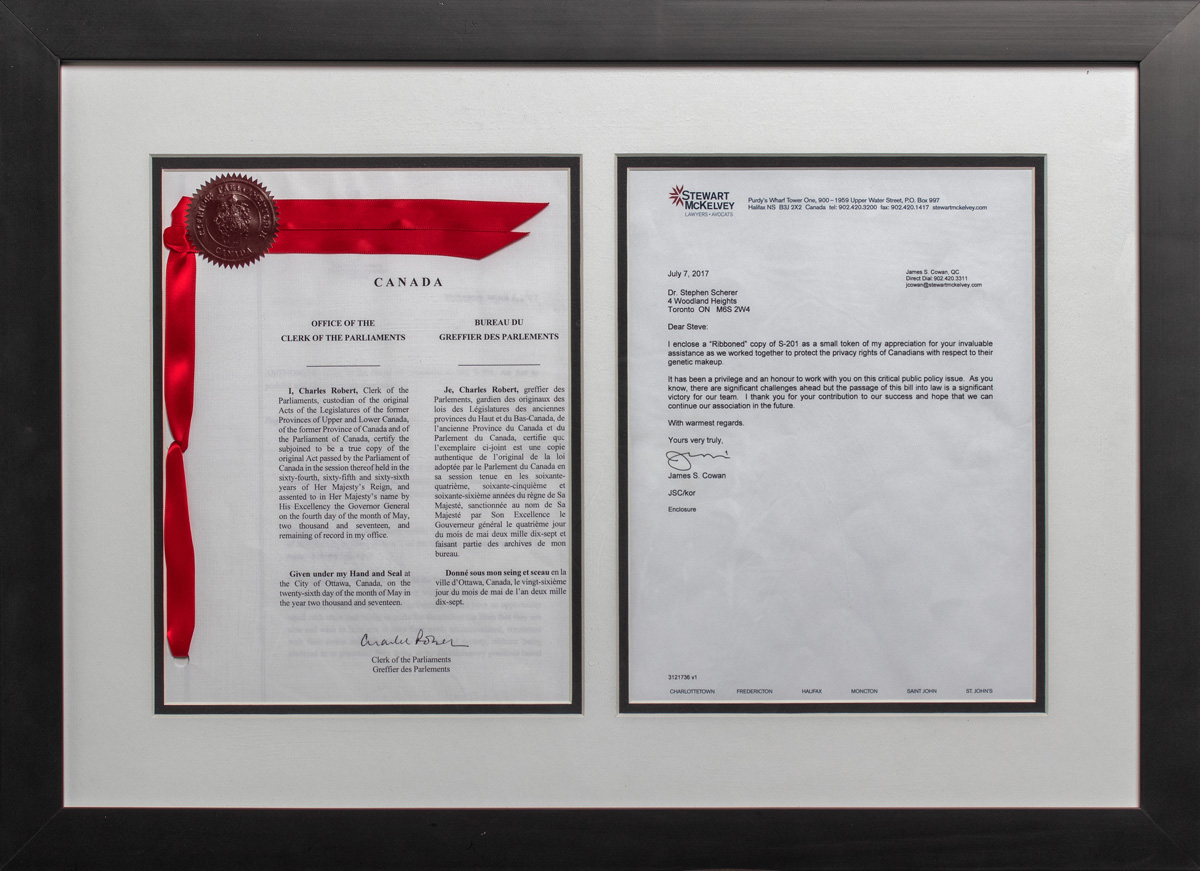 In 2016 and into 2017, Drs. Ronald Cohn, Stephen Scherer and others at SickKids advocated for the creation and implementation of Bill S-201 to protect the privacy and rights of Canadian with regards to their genetic make-up. S-201 was passed into law to prohibit and prevent genetic discrimination.