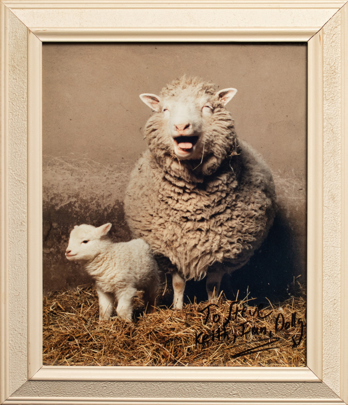 Dolly the Sheep was the first mammal to be cloned from an adult somatic cell. Dolly was cloned by associates of the Roslin Institute in Scotland, proving that a cloned organism could be produced from a mature cell from a specific body part. Dolly lived in a flock of sheep at the Roslin Institute and had six lambs - her first, Bonny, is also pictured. This personalized photo of Dolly the Sheep was given to Dr. Stephen Scherer by Drs. Ian Wilmut and Keith Campbell during a visit to shoot the scientific documentary “After Darwin”.