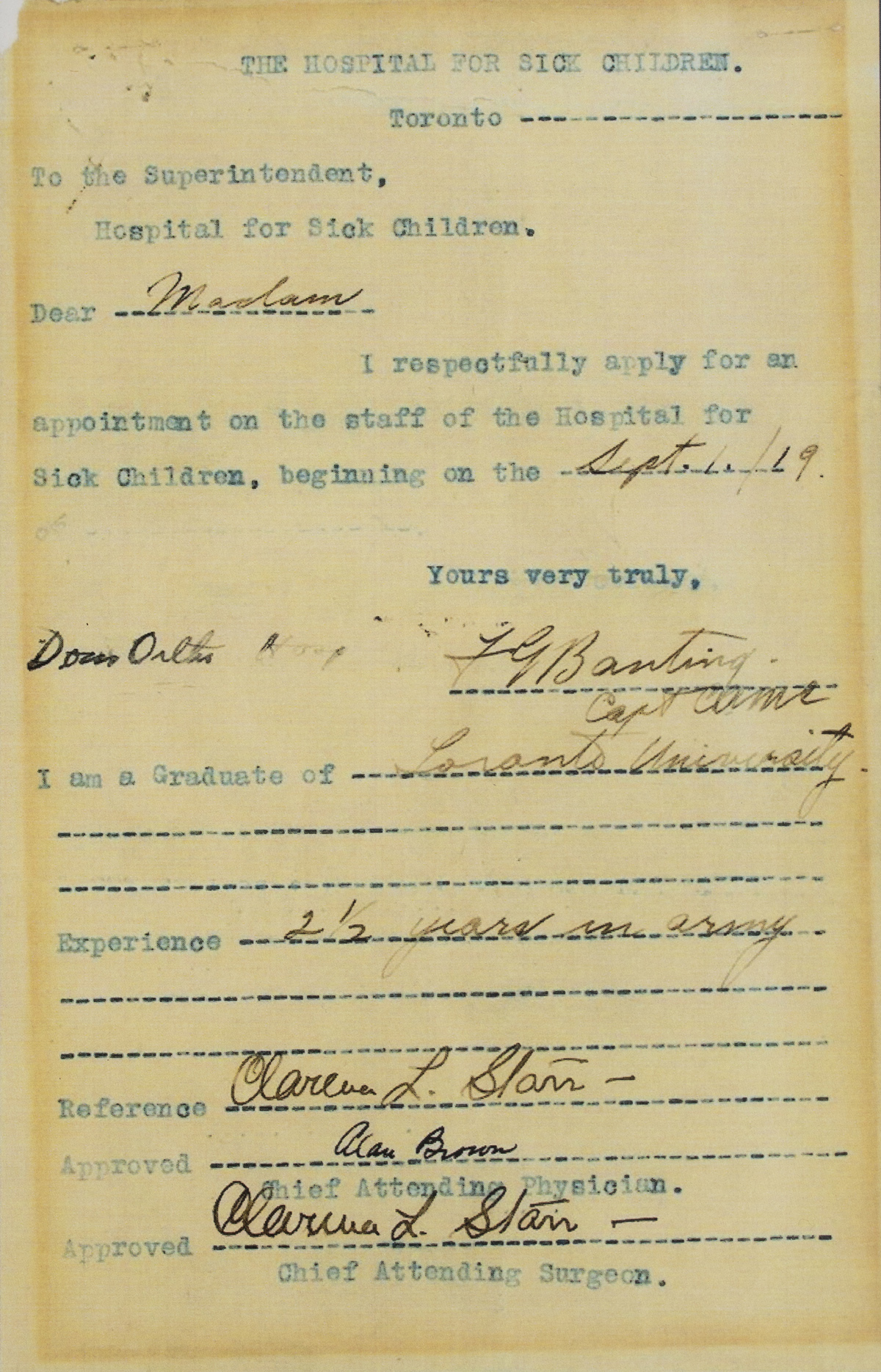 This is an image of Dr. Frederick Banting's 1919 job application to work as a surgical resident (1919–1920) at SickKids after he returned from the war. In 1923 Dr. Banting returned to SickKids as an “Active Staff – Department of Medicine”, and continued to be listed as staff into WWII, at which point he is also listed as “on active service,” and continues to be on our staff lists until his death in 1941. One of the greatest medical breakthroughs in history, insulin was discovered by Dr. Banting alongside Drs. Charles H. Best and J.J.R. Macleod in 1921 at the University of Toronto. This document represents a crucial moment in Banting's journey and highlights the significant contributions he would later make in the field of medicine, ultimately revolutionizing the treatment of diabetes. Sir Frederick Banting won the Nobel Prize in Physiology or Medicine “for the discovery of insulin” in 1923.
