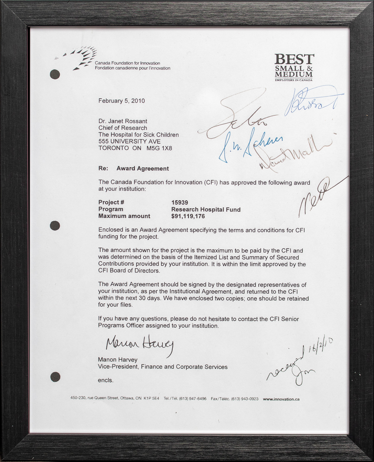 Received on February 5, 2010, this letter confirms that the Canada Foundation for Innovation approved a $91,119,176 award to SickKids for the building of the new research tower, which was named the Peter Gilgan Centre for Research and Learning in 2012 with the historic $40 million gift from Mr. Peter Gilgan, Founder and CEO of Mattamy Homes. The award from the Canada Foundation for Innovation is the largest grant to date received at SickKids. The awards letter is signed by Dr. Janet Rossant, Chief of Research (2005–2015), Dr. Michael Salter, Chief of Research (2015–2020), and Dr. Stephen Scherer, Chief of Research (appointed 2021). These three, along with Drs. Peter Dirks, Fred Keeley and David Malkin, along with Gwen Burrows, were involved in aspects of writing the successful grant as well as participating in the site visit.