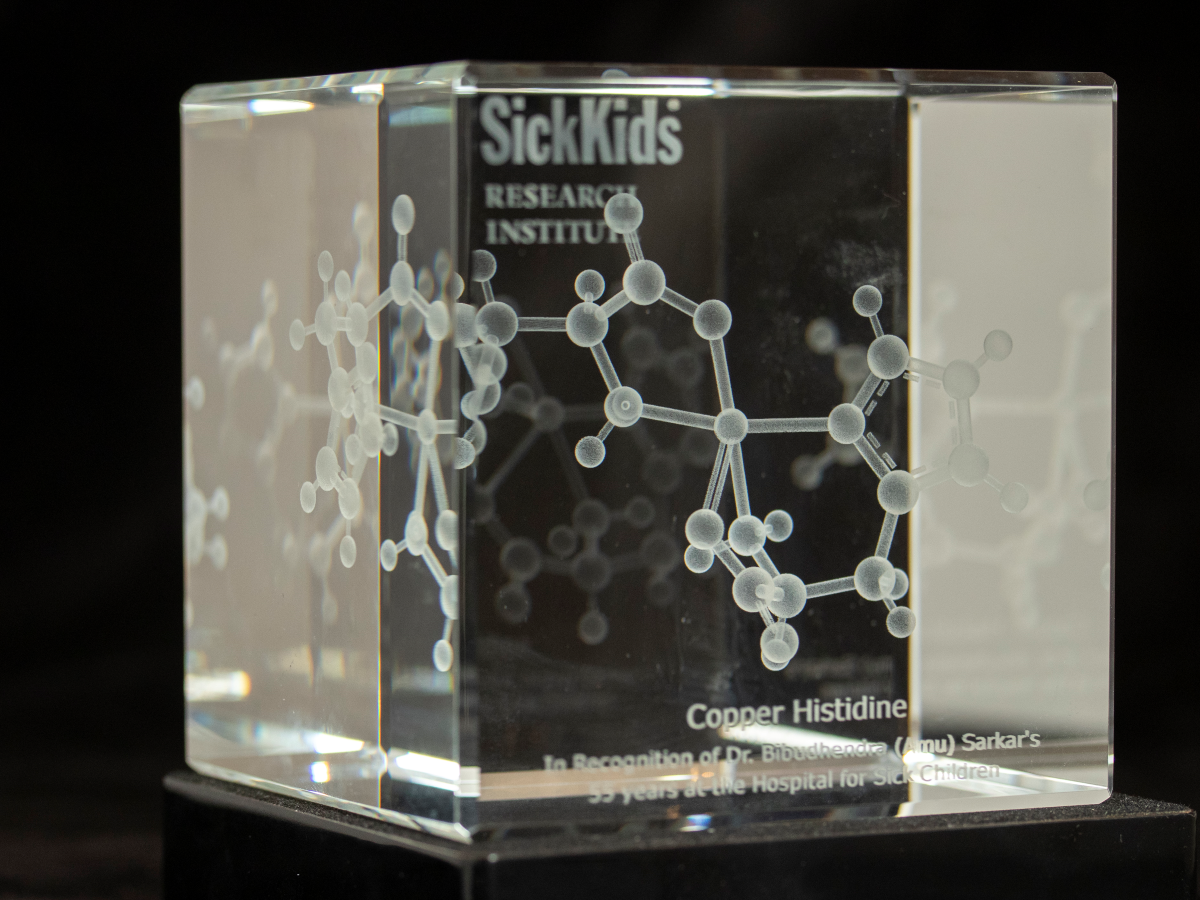 Dr. Bibudhendra (Amu) Sarkar was the first basic scientist hired by the SickKids Research Institute in 1964. Dr. Sarkar's research focused on the significance of metals in biological systems. To celebrate his outstanding contribution to biochemistry, the three-dimensional model of the copper histidine molecule was presented to Dr. Sarkar in February 2020 to commemorate his 55 years of service at SickKids.