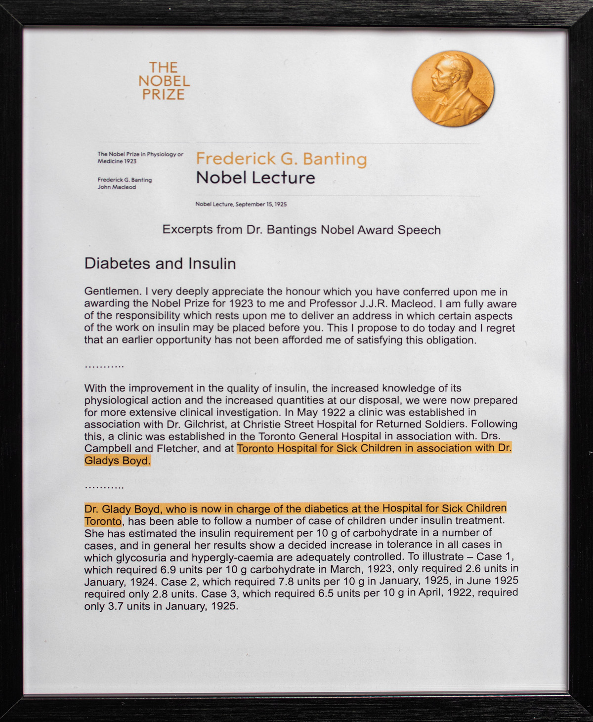 Dr. Banting's Nobel Prize acceptance speech references Dr. Gladys Boyd, Head of the SickKids Diabetes Program. Boyd administered insulin to Elise Needham, an eleven-year-old girl who is the first child in the world to recover from a diabetic coma.