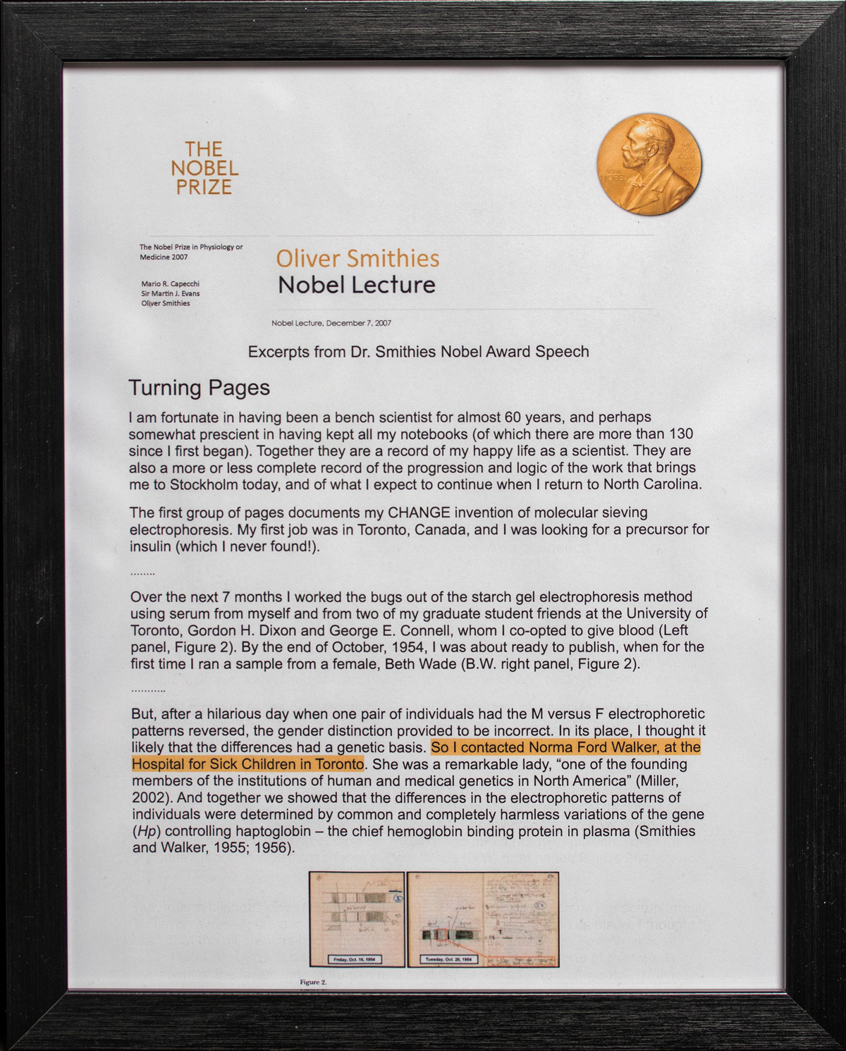 Dr. Oliver Smithies Nobel Prize speech references Dr. Norma Ford Walker, the SickKids scientist who treated and co-wrote the book "A Biological Study of the Dionne Quintuplets." Ford Walker completed her PhD in Zoology at the University of Toronto in 1923. From 1947 to 1962, Dr. Ford Walker was the first Geneticist-in-Chief at SickKids. She taught Smithies genetics in her lab and with him, demonstrated that haptoglobin types were inherited.