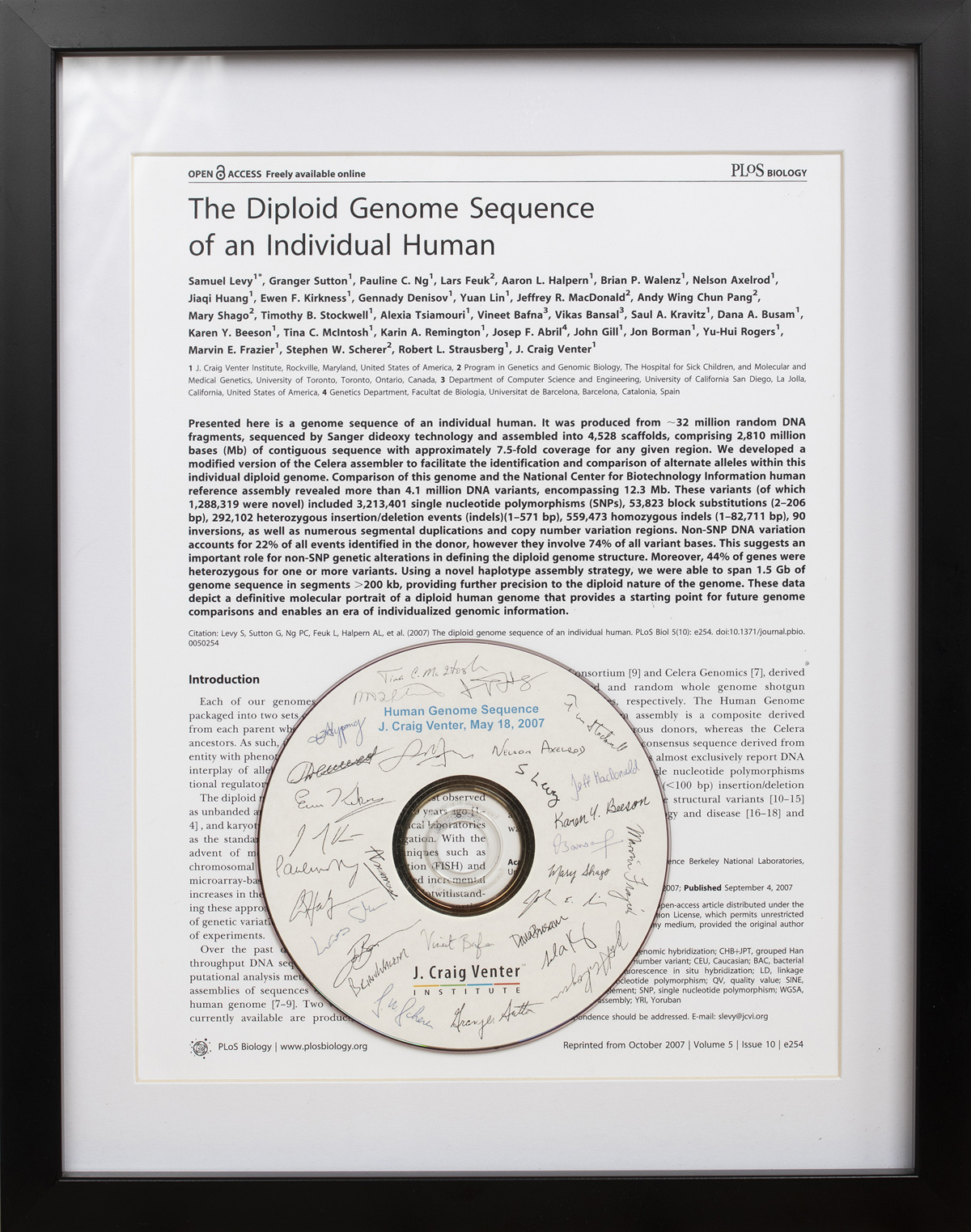 "The Diploid Genome Sequence of an Individual Human" is a significant scientific paper published in 2007 that documented the sequencing and analysis of the first complete diploid human genome (of Dr. J. Craig Venter). The research was a collaborative effort between Celera Genomics, later the Venter Institute, and SickKids researchers who played a key role. The research team at SickKids, led by Dr. Stephen W. Scherer, contributed their expertise in genetics and genomics to annotate the sequence data and interpret the results. This landmark study showcased the technical advancements in sequencing technology and set the stage for future studies on human genetic variation, personalized medicine, and the understanding of genetic influences on health and disease. The accompanying CD-ROM in the framed paper is one of 12 originals made carrying the first genome sequence along with the signatures of the main authors. The cost of this first genome sequence was estimated to be $70 million dollars. A year later, using next generation sequencing, a team at Baylor sequenced the genome of Dr. James Watson for $2 million dollars and now it can be done for less than $1,000.