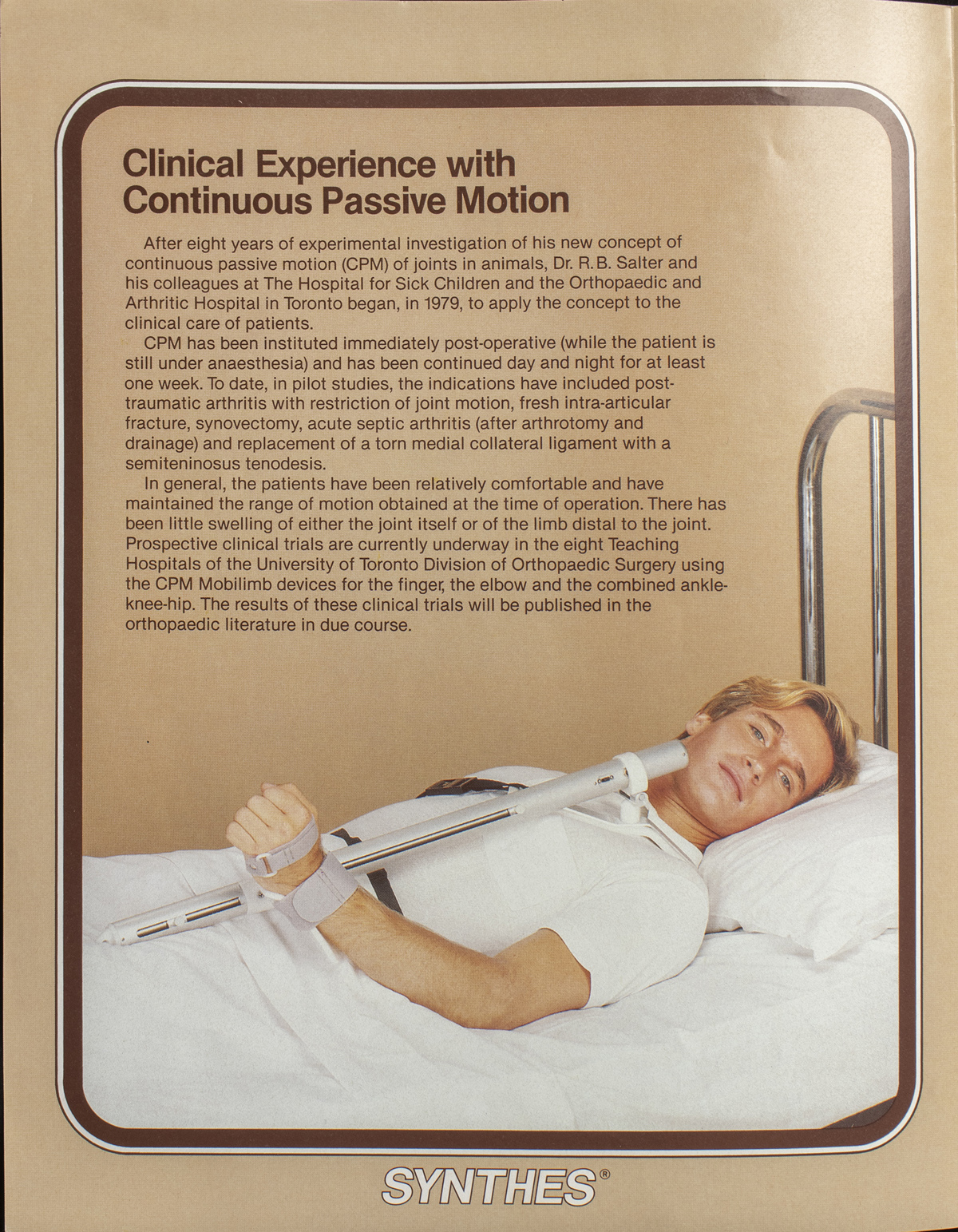 The Salter Continuous Passive Motion (CPM) device was a revolutionary development in the field of orthopedic surgery. It was invented by Dr. Robert Salter, an orthopaedic surgeon who began at SickKids in 1955, when Dr. Alfred Farmer was head of surgery. The device is used post-operatively to assist patients regain range of motion in their joints, particularly the knee. The Salter CPM works by continuously and gently flexing and extending the joint, preventing the formation of scar tissue and promoting healing. It was a major improvement over traditional post-operative treatment, which involved immobilizing the joint with a cast or brace. Today, the Salter CPM remains an important innovation in the field and has had a significant impact on patient care and recovery. The main auditorium of the Peter Gilgan Centre for Research and Learning is named after Dr. Salter with a bust statue of him located outside.
